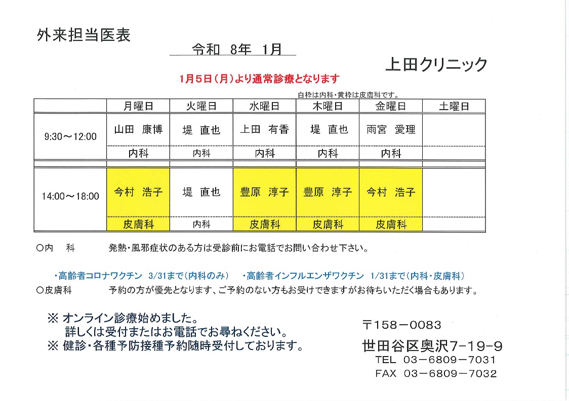 ○外来担当医表(令和8年1月)・1月 休診日のお知らせ