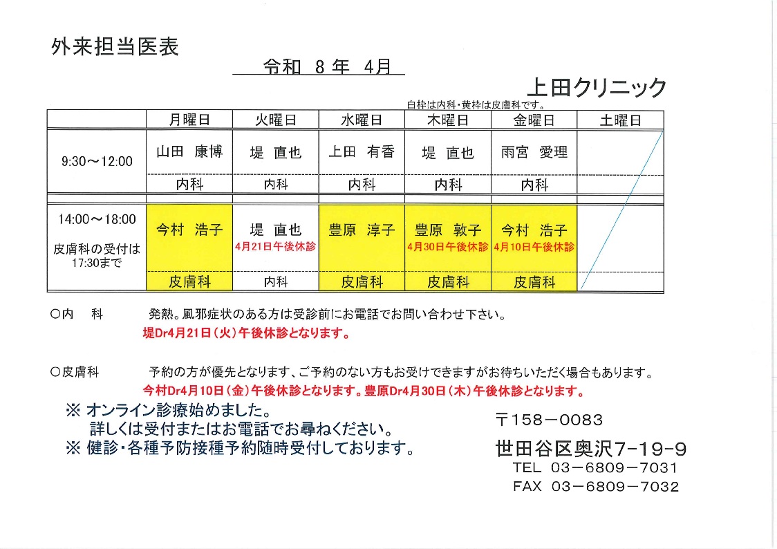 ○外来担当医表(令和8年4月)・4月 休診日のお知らせ